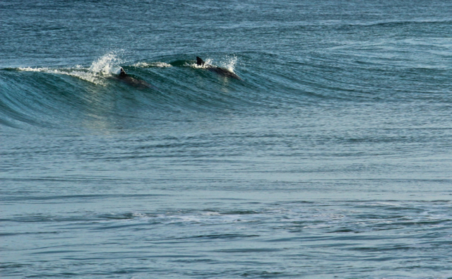 I fight the temptation to hold my camera to my face, as I spy the ocean giants for the first time. With White Bellies they lurch and spin above the waves, a split-second tease before returning to their underwater home. A few dolphins playfully join the action, as if jealous that their larger compatriots are hogging the limelight. As the waves crest, my lucky camera lens is just able to catch their streamlined silhouettes.