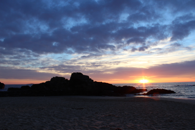 Orange dawns and purple sunsets sandwich warm but often, windy days spent swimming, strolling and collecting firewood. Minutiae, ignored in daily life, slowly come into focus; The spirals of shells in all their detail, the myriad swirls of white clouds overhead, the behaviours of seabirds that gather in a cackle on jagged black rocks, and the glittering contents of shallow rock pools.