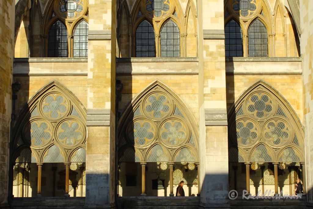 Visitors walk under the sun-drenched archways of Westminster Abbey’s cloisters