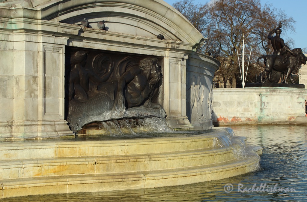 The Victoria Memorial sits just outside Buckingham Palace, guarded by majestic bronze and marble statues on all sides.