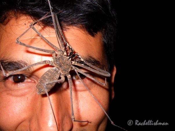 Oh my word that spider is enormous!! I know he must be used to things like that but I would freak out if anything half the size of that came within a meter of me, let alone crawled across my face! And you can see he is smiling underneath that giant thing!