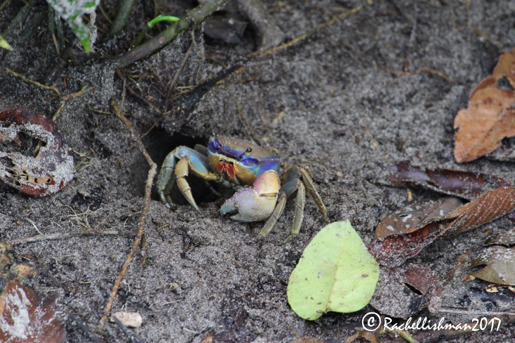 Less sinister perhaps, are the butterflies and hermit crabs that cross my path. Almost the size of my hand with a 12cm wingspan, colossal blue morphs change from vivid blue to intricate brown and white circles as they flutter past. Underfoot I have to take care not to tread on crabs carrying their colourful homes on their backs – diving into tiny burrows or collecting inside the trunks of large trees.