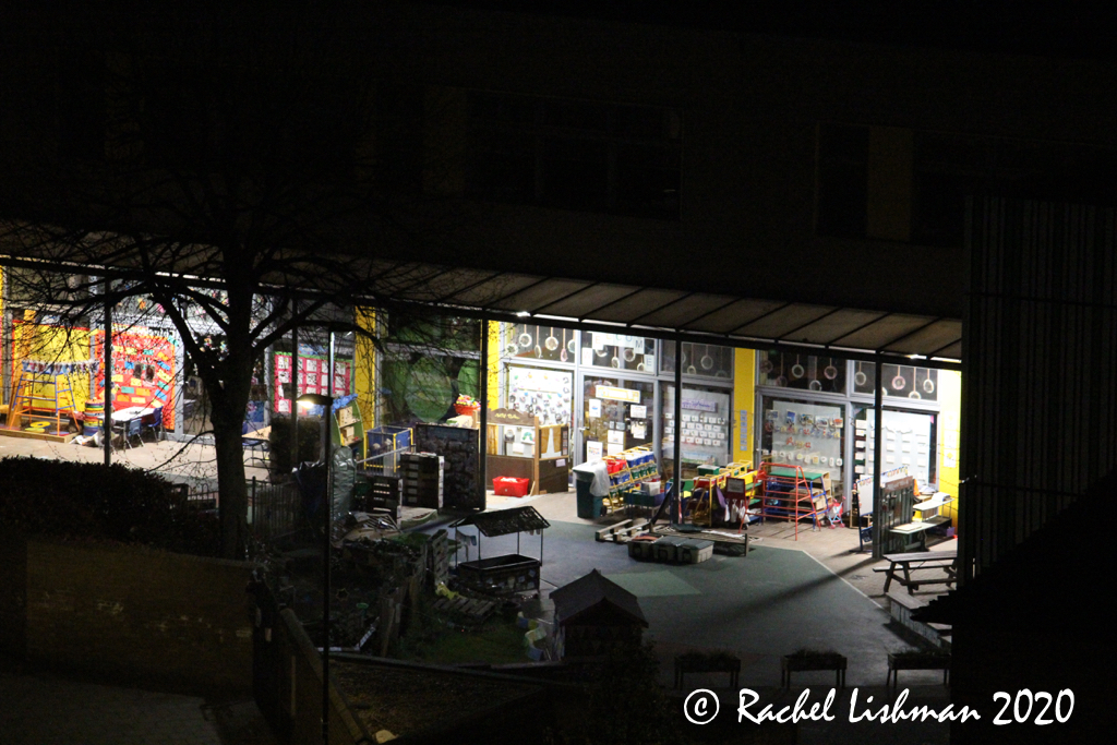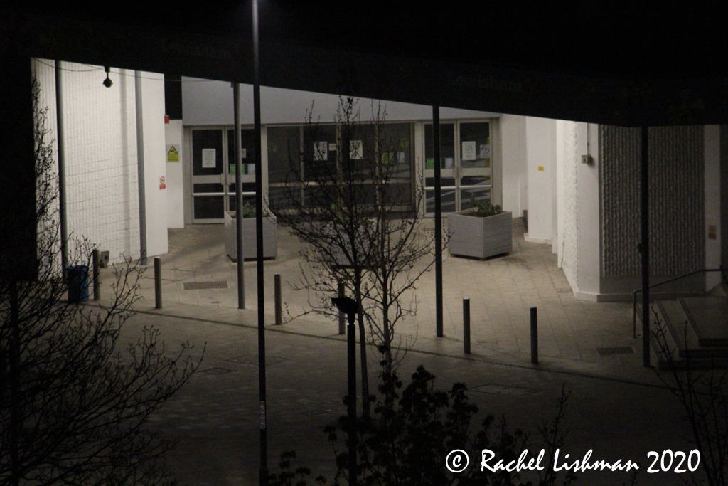 I started shooting the still automatic doors of the local shopping centre, the front yard of the closed local school with its welcoming porch light still on, and the South Eastern trains that rattled past almost completely empty. The two people I saw over the space of a whole hour looked lonely and trapped in their own thoughts: A dog walker caught in a streetlight and a single commuter checking his phone.