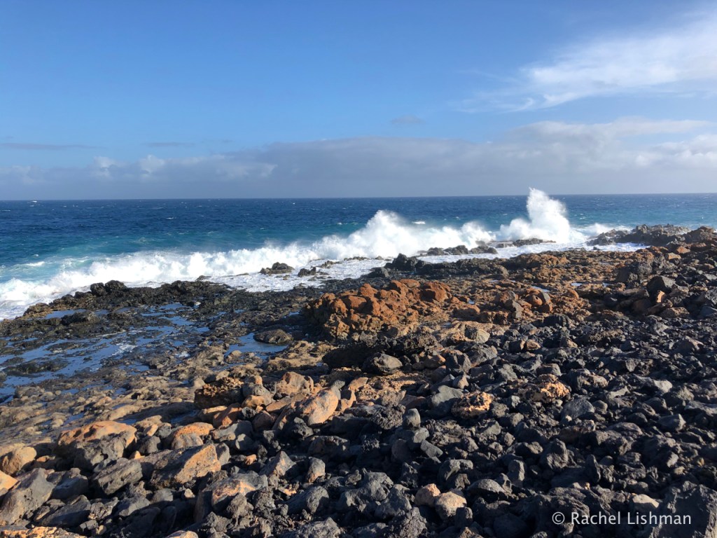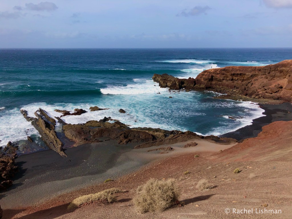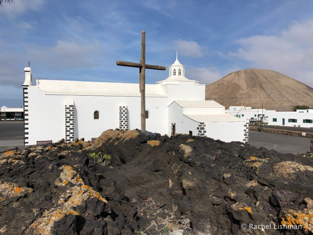 From left: Playa de Las Cucharas, Costa Teguise; A church built alongside lava flow on the edge of the volcanic national park; The Atlantic crashing ashore on the Costa Teguise.