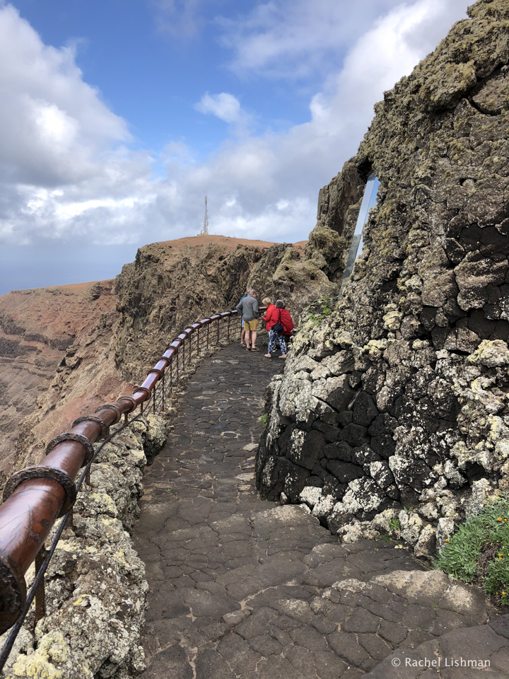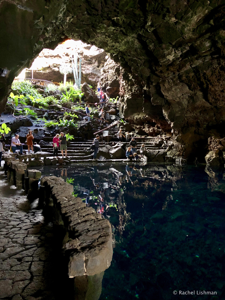 Clockwise from the top: A staircase at Jameos Del Agua; The cliff walkway at Mirador del Rio; The cafe inside the cliff at Mirador del Rio; Visitors look at the albino crabs of Jameos Del Agua.