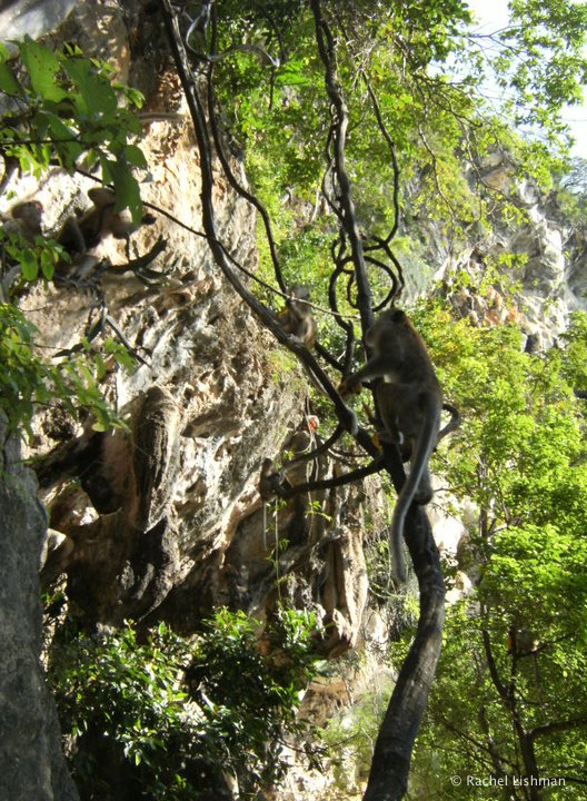 Feet back on firm ground things were slightly more familiar. I strolled around the peninsula’s tip, which was shaded by thick vegetation. I wondered whether I’d accidentally signed onto another jungle trek as boisterous monkeys swung from vines and eye-balled me curiously from overhangs. Those same cream curtains that had dangled over the illusive entrance of Pak Ou Caves a few weeks before.