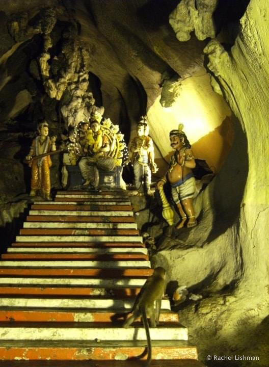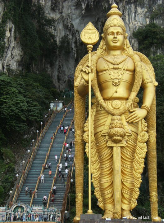 Manmade edifices of deities in pink, bright blue and orange guarded entrances to all manner of shrines. The largest of which was the colossal Murugan, a Hindu deity covered in gold paint. His towering presence made the 270 steps behind him seem trivial as they reached upward, like the segmented back of a marauding caterpillar, to the main cave. Nothing, I quickly realised, stretches the concept of perspective like a photo of the ever-upright Murugan against the stairway to Temple cave.